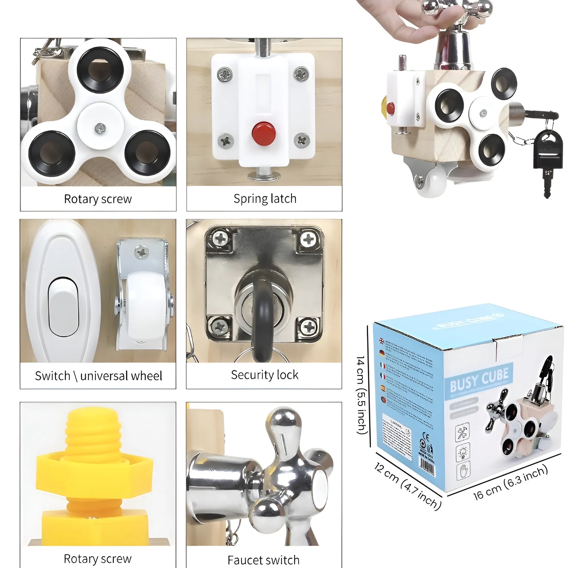 This busy cube combines seven hands-on activities including spinning gears, sliding beads, shape matching, latches, and more. Each side offers a different task, keeping kids engaged while exploring multiple ways to play.