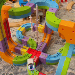 Der elektrische Zug fährt gleichmäßig über die Schienen und erweckt jede Strecke zum Leben. Kinder lieben es, ihn durch ihre selbstgebauten Routen fahren zu sehen und dabei spielerisch zu verstehen, wie Bewegung und Schwerkraft funktionieren.
