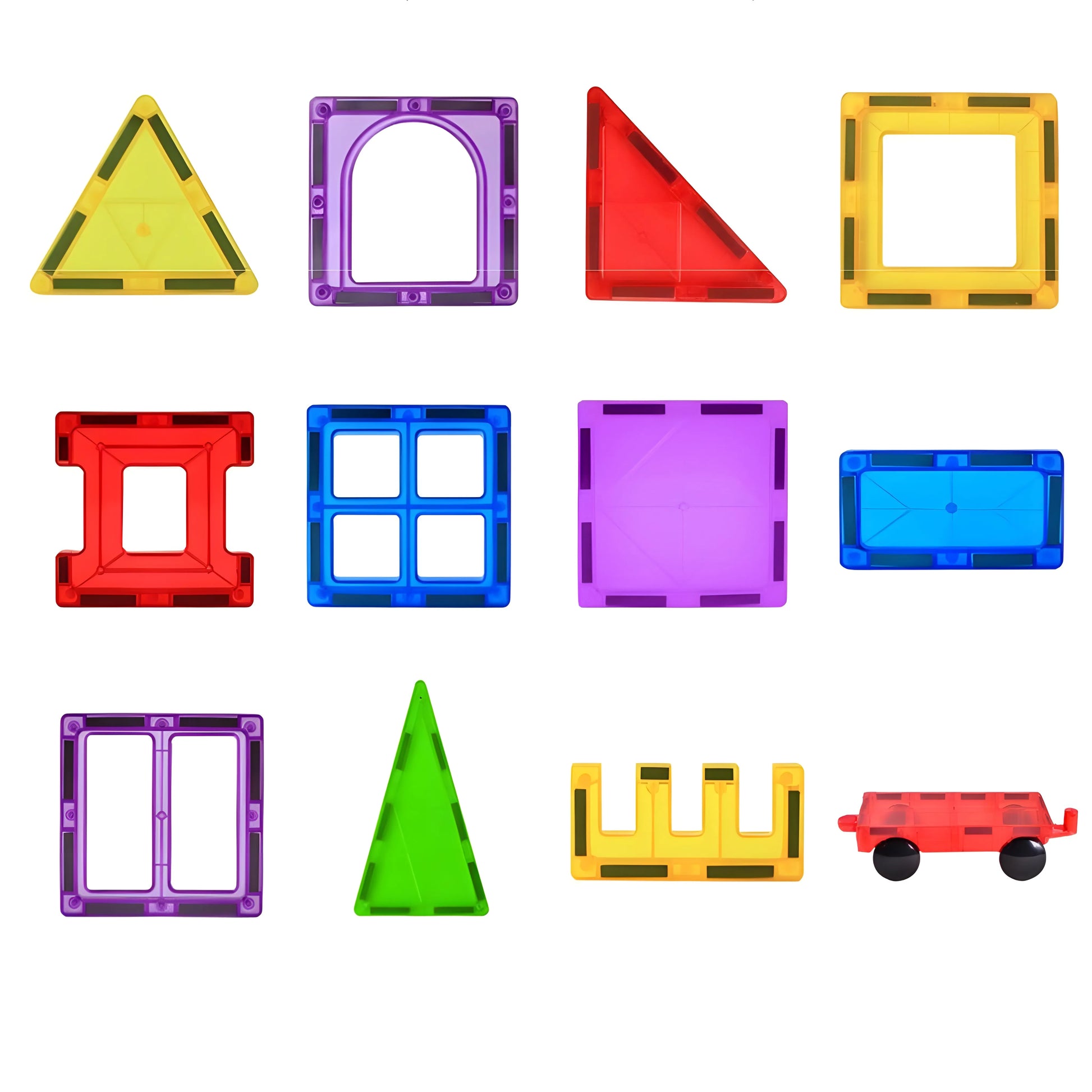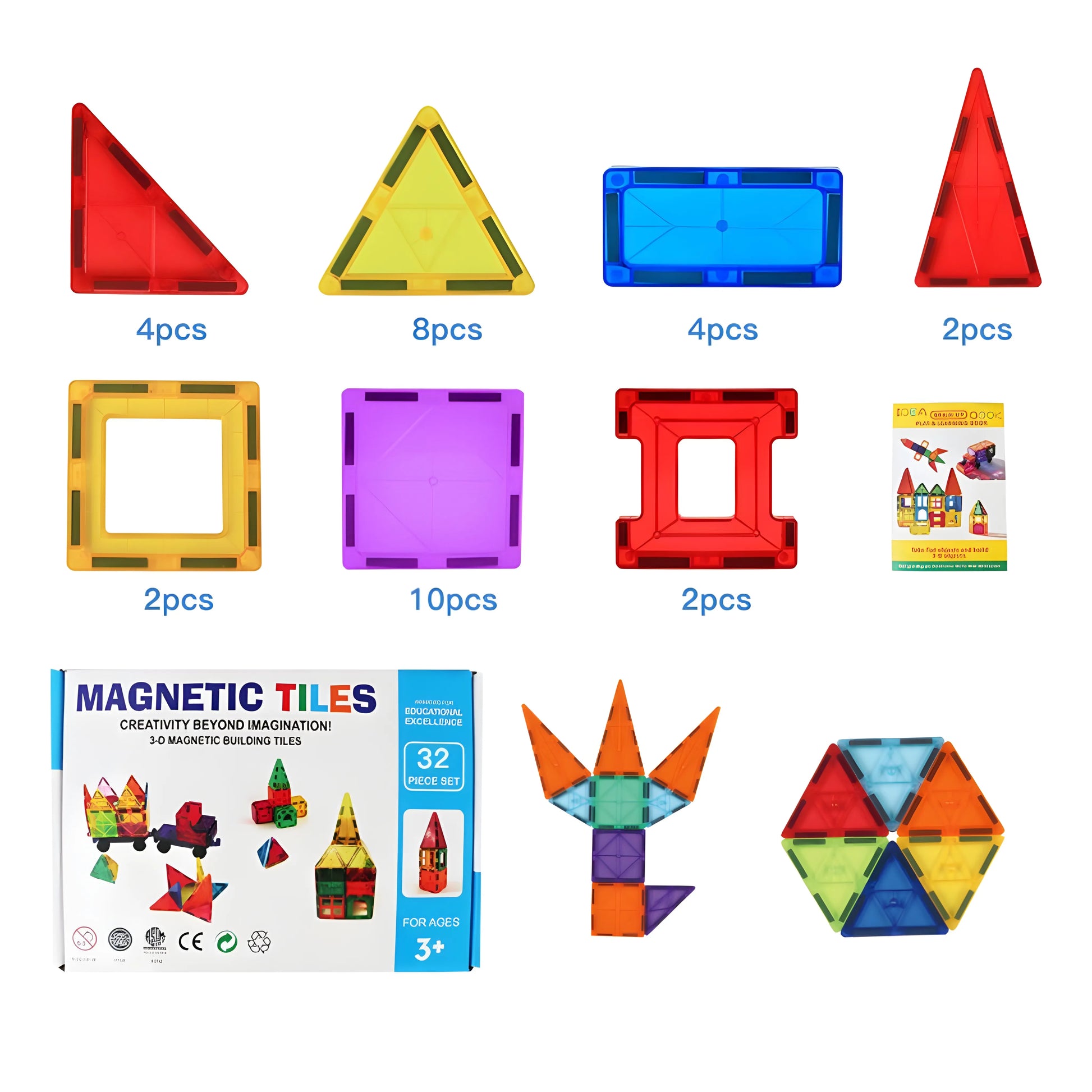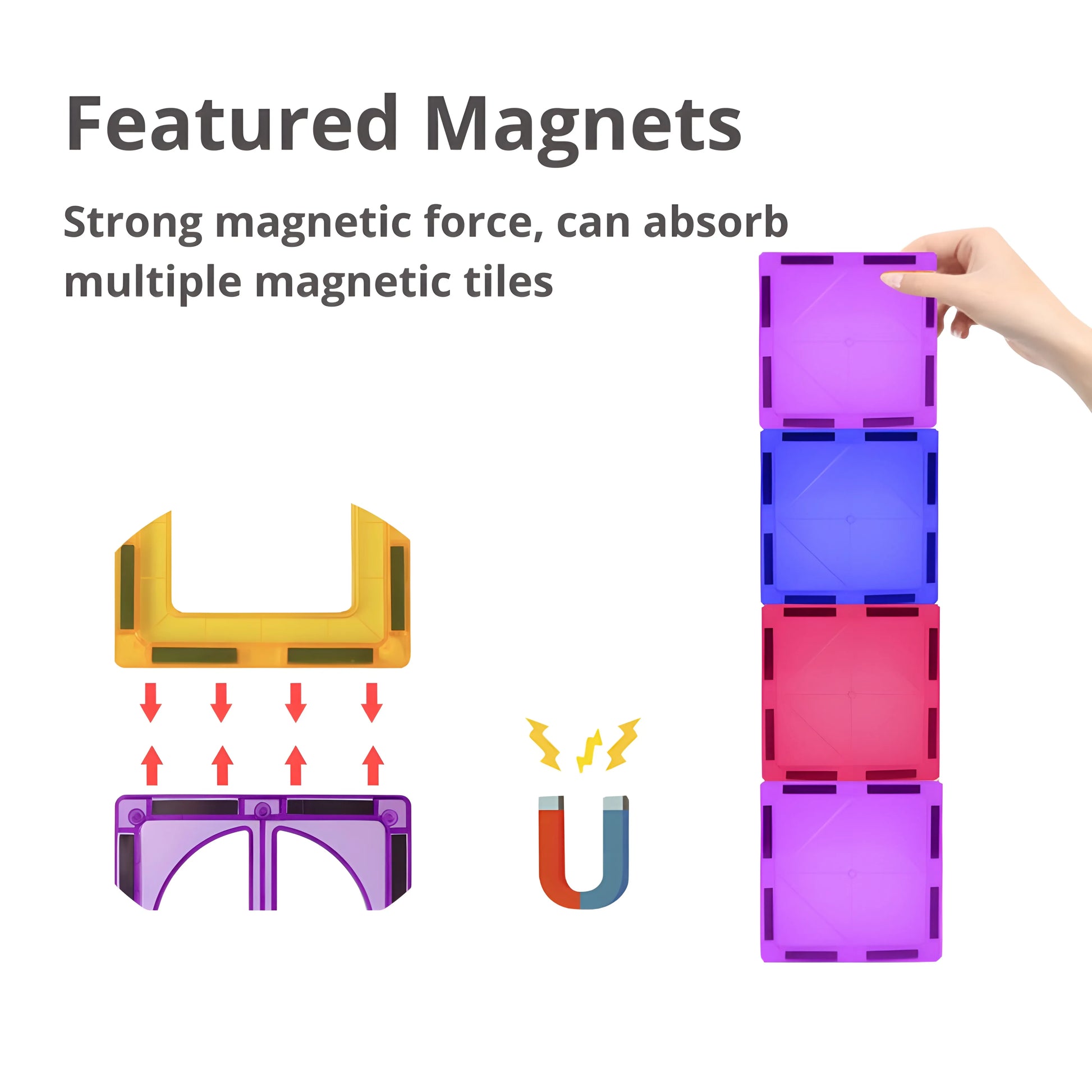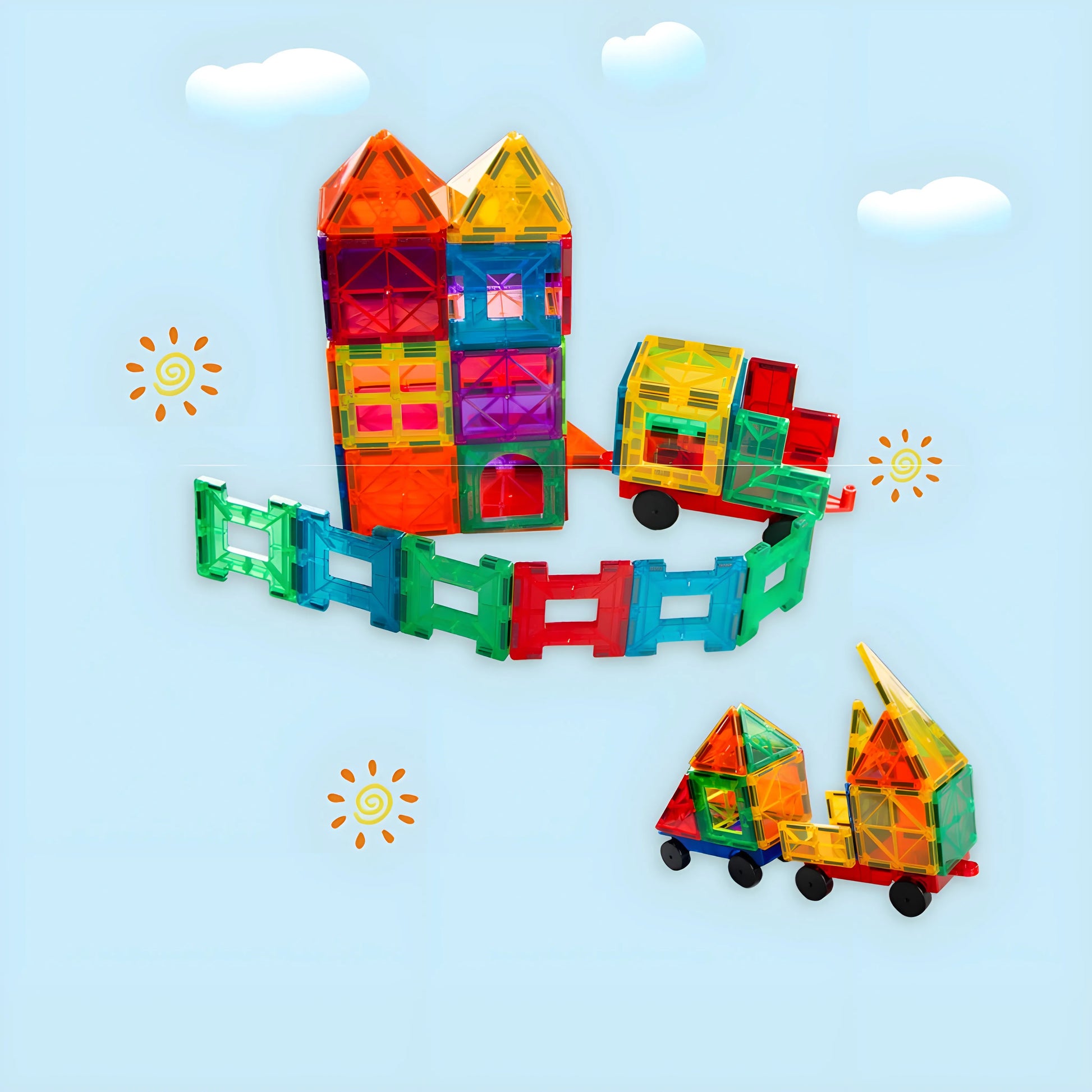 Spark creativity with Onenazo Magnetic Tiles with Cars. Choose from 32, 48, 60, 88, 100 pcs sets for kids age 3+, build cars, towers, and more with safe, colorful magnetic tiles.