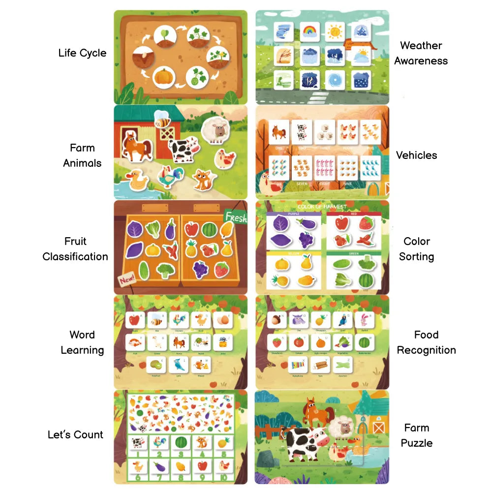 🎨 Learn through play - Each page introduces early learning skills like colors, shapes, numbers, letters, and everyday life tasks. Kids can stick, pull, flip, and match pieces freely, helping develop fine motor skills, hand-eye coordination, and problem-solving in a natural, playful way.