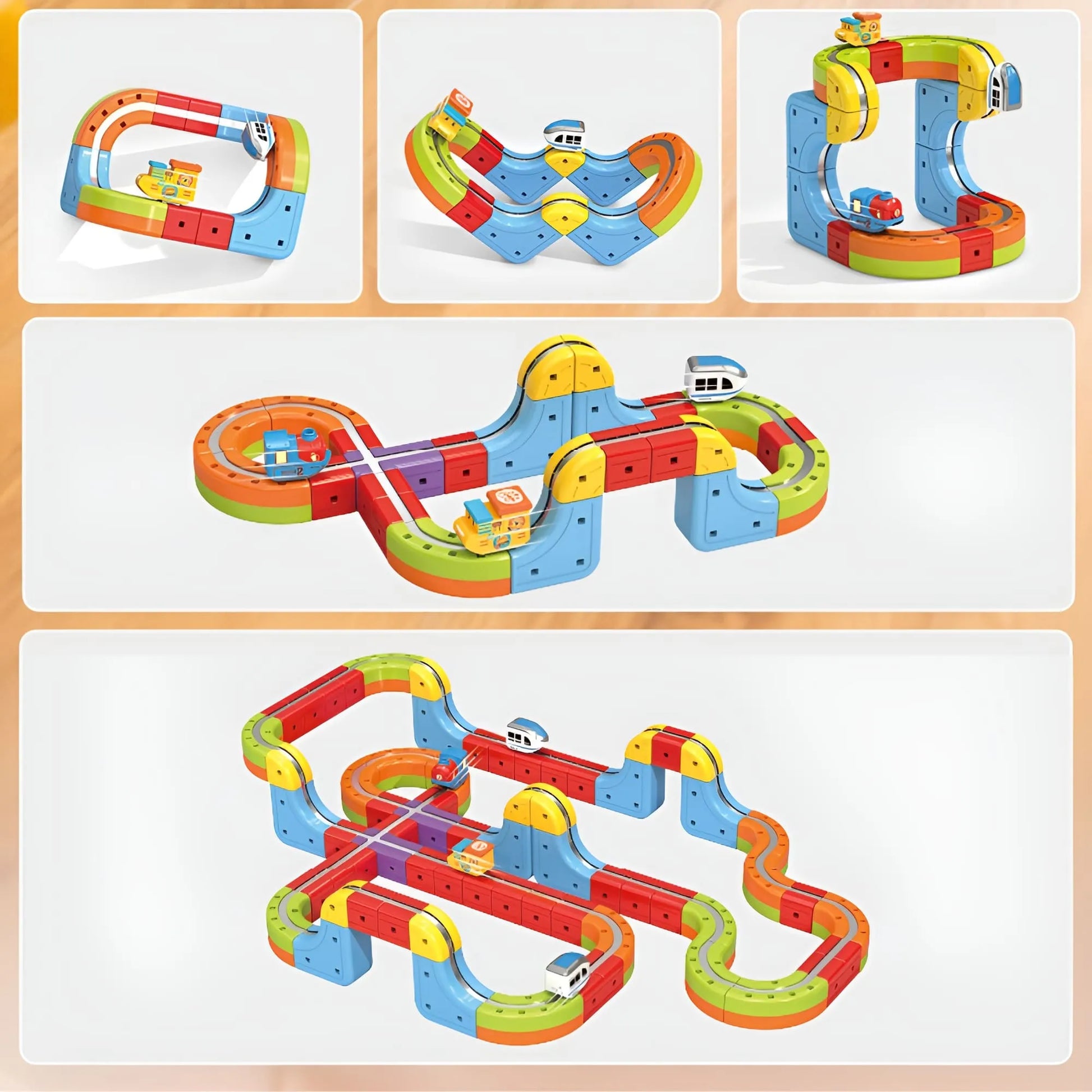 Building different track structures helps children develop spatial awareness, problem-solving skills, logical thinking, and creativity in a fun, screen-free way.